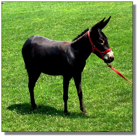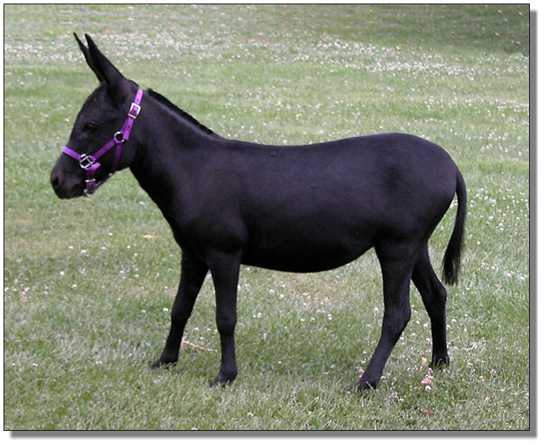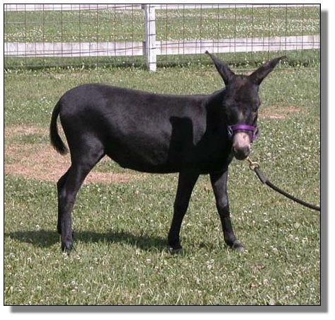 Want black? This gal is ebony black with light points and no visible cross. She is out of my best black jenny “ Sootie”, 33” who is Mr Perlino’s FULL sister. (Ivory gene?). Morticia is 3 years old. She is offered bred for Spring 05 with her first foal, to my newest herdsire, Braying Pines BJ ZZ Topp, black, drafty, light points with no cross, 32”, and the added appeal of some very different black genetics that will enhance your black breeding program.