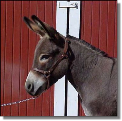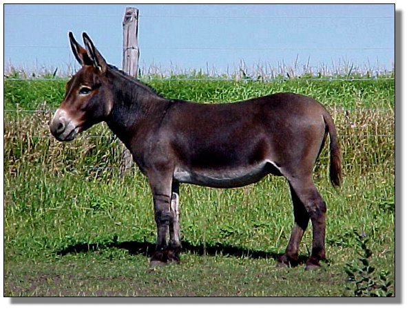 A stylish brown jack, has a neat small head, straight legs, correct bite, great body conformation, and the best of dispositions. He is great to pasture breed with as he never bothers the foals and gets the job done 98% of the time on the first heat period. A great breeding jack.