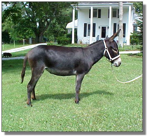 Leane is a very nice little brown Jenny with a dark cross, good conformation, and very gentle. She has dark genes and when bred with a black or dark brown jack will most likely have a black or very dark brown foal. She is small, 31” on 3/30/04, and was 22” tall at birth. She will be three years old Aug 18, 2004. She has brown and dark brown genes on both sides of her parents, out of TSC Famous Amos.