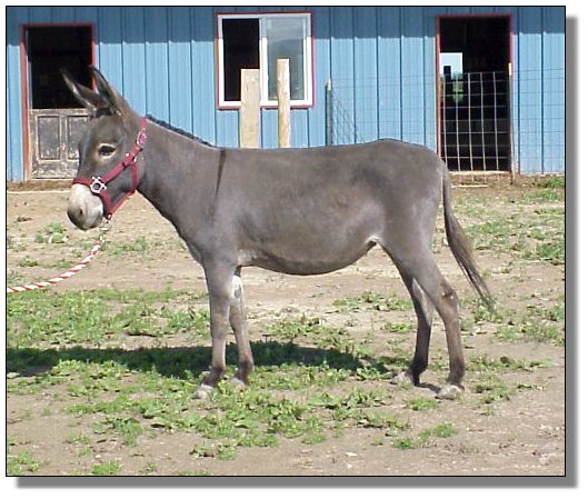Like the color of a fine blush Zinfandel, Blush matures more beautifully everyday. She is a full sister to Champion AMDC Futurity jack Renegade. X’Treme has an impressive show record; World Champion Jack (‘98 Calgary Stampede), Champion Jack ‘99 Mini Donkey Extravaganza, 2000 Maturity Champion Jack, Reserve Champion Jack NA Miniature Donkey Show & 3rd mature jack at the 2002 NMDA Shelbyville Show. Cher’ie, our “Quarter Horse Jen”, is a great show jennet as well, having won her class 2x at the World Show, Champion Jennet at the Miniature Donkey Extravaganza, and Champion Maturity Jennet. Blush is the only X’Treme daughter we will be offering for sale this year , they are as rare as hen’s teeth. Grab on to this little beauty and watch as she blossoms into a fine vintage.