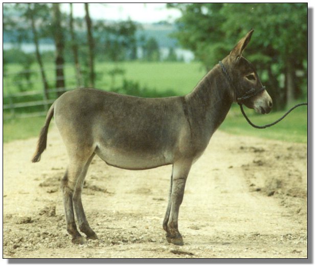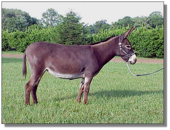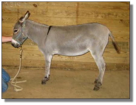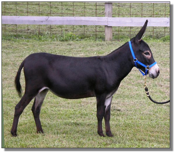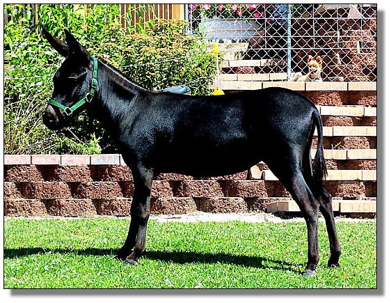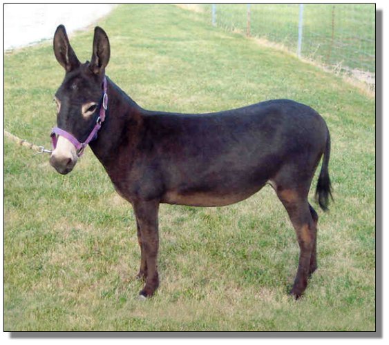 An exceptional, nice black jennet, that certainly will be an asset to anyone's herd of donkeys. Great body conformation, a real sharp built jennet, correct bite, real straight legs and a wonderful disposition. Sired by a good black jack and her Dam is a dark brown jenny that has produced real nice foals for me. This jennet won't get big on you, she will stay small.