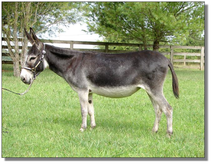 Sable is true to her name. She has a lot of color in her background, and she has gray & white roaning throughout her coat. Sable has a loving disposition and is blossoming into a beautiful jennet. She will be ready in September to be bred to your jack.