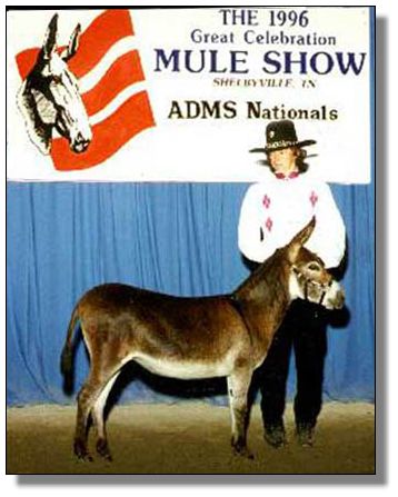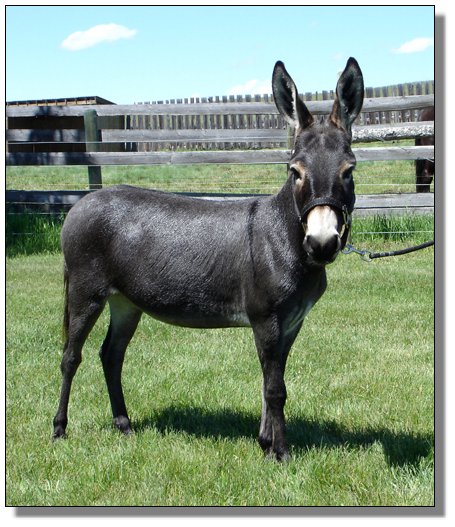 If color, genetics, conformation & disposition all wrapped up in one sweet package is what you crave, look no farther than MISTY MAID. Her color is like divine chocolate iced with fine sugar. You won't find a more exotic color pedigree, than this 3rd generation roan, with her strong black heritage. Misty Maid will be shown at the 2006 World Champion Miniature Donkey Show. Like a sweet chocolate, Misty Maid will be desired by all, but only one can have her….