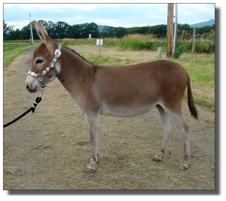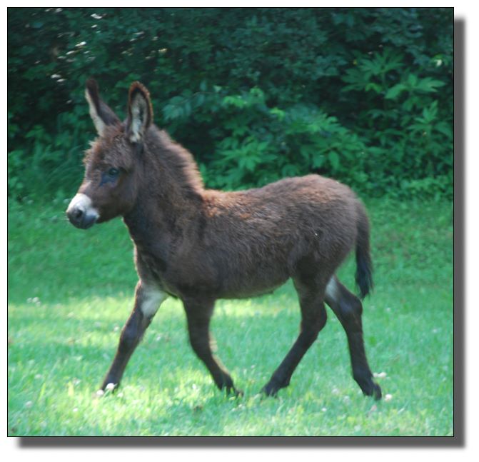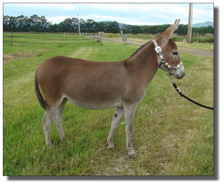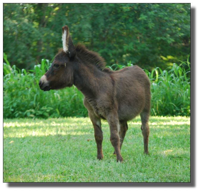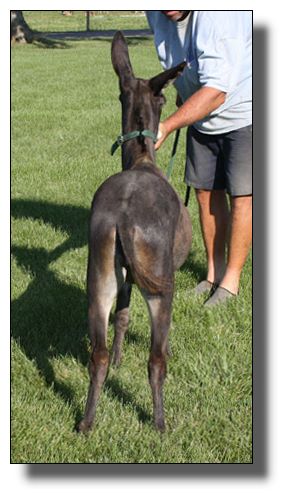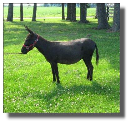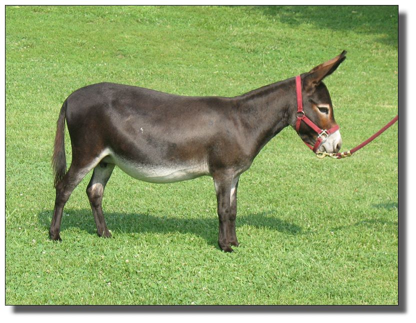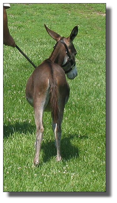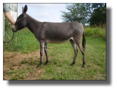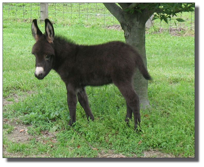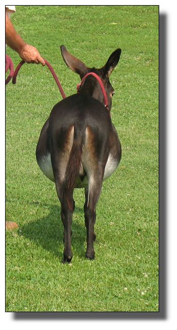 Aleix is a nice, black NLP jennet, with a heavy dose of good spot ancestors on both her sire's and dam's sides. Her pedigree sports MGF, Cobra, Sunset Acres and Circle C lines, all well known breeders of fine donkeys. Aleix, paired with a spot jack when mature, should give you a good chance for a spotted foal. Don't pass up on an opportunity like this.