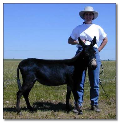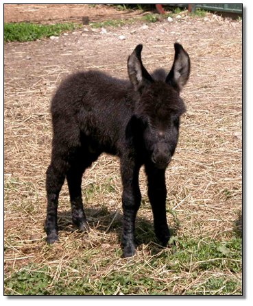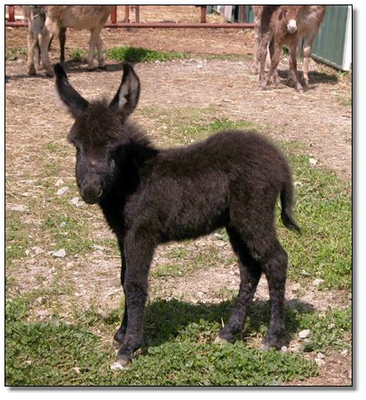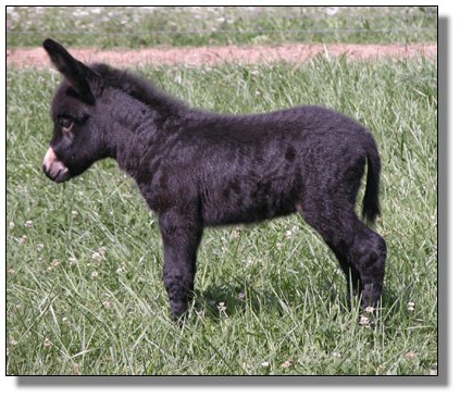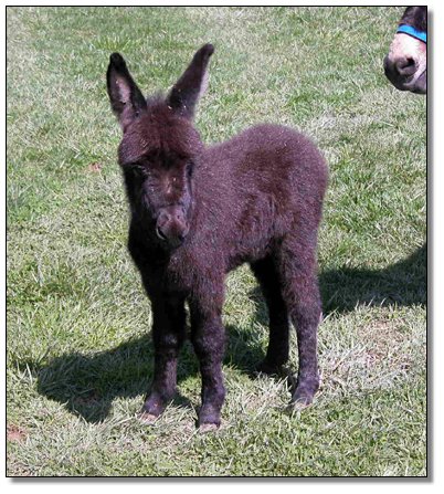 This is our first foal for 2004, and we are really pleased with Chaboom's foals! Gypsy Rose, his dam, has a wonderful build, and is also a glossy black color. This little jack is so square, with presence galore, and all black.