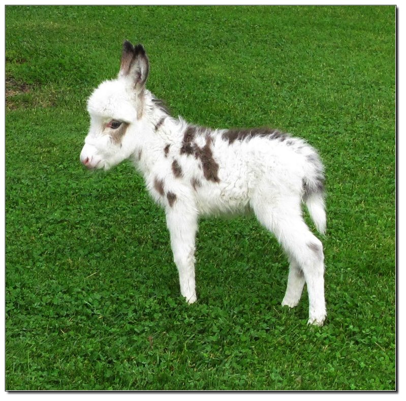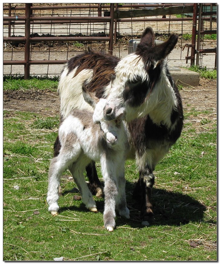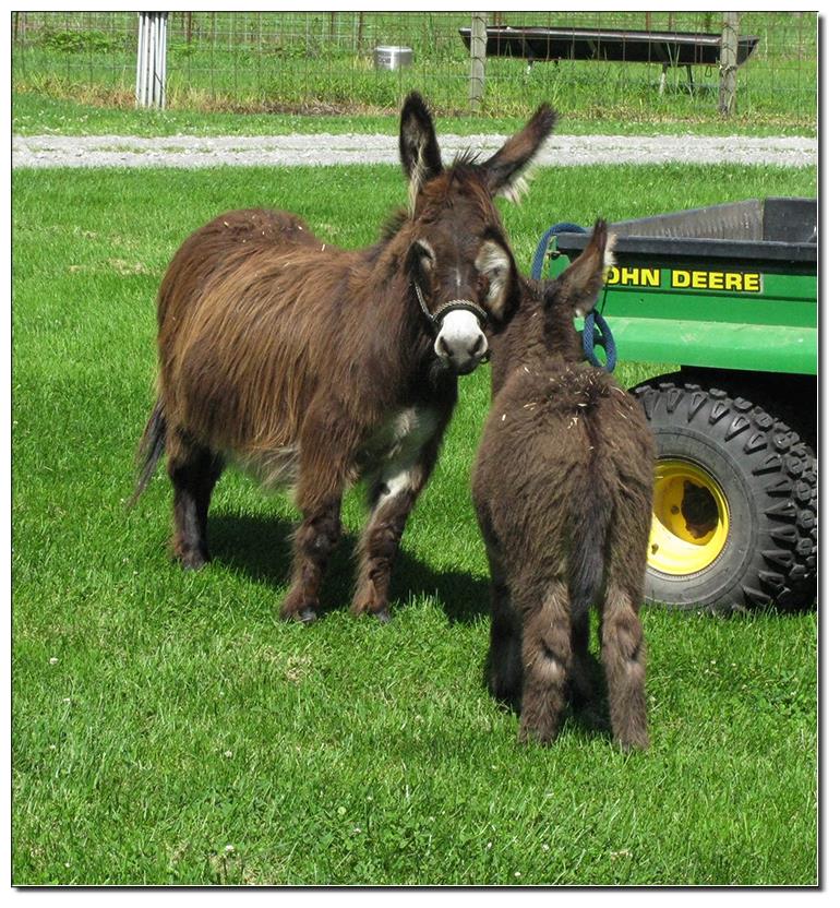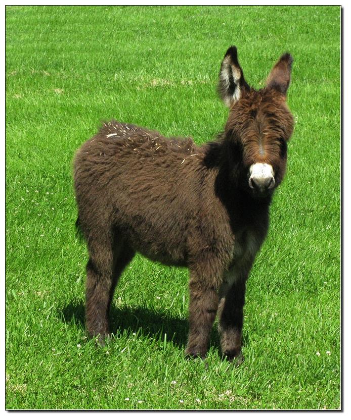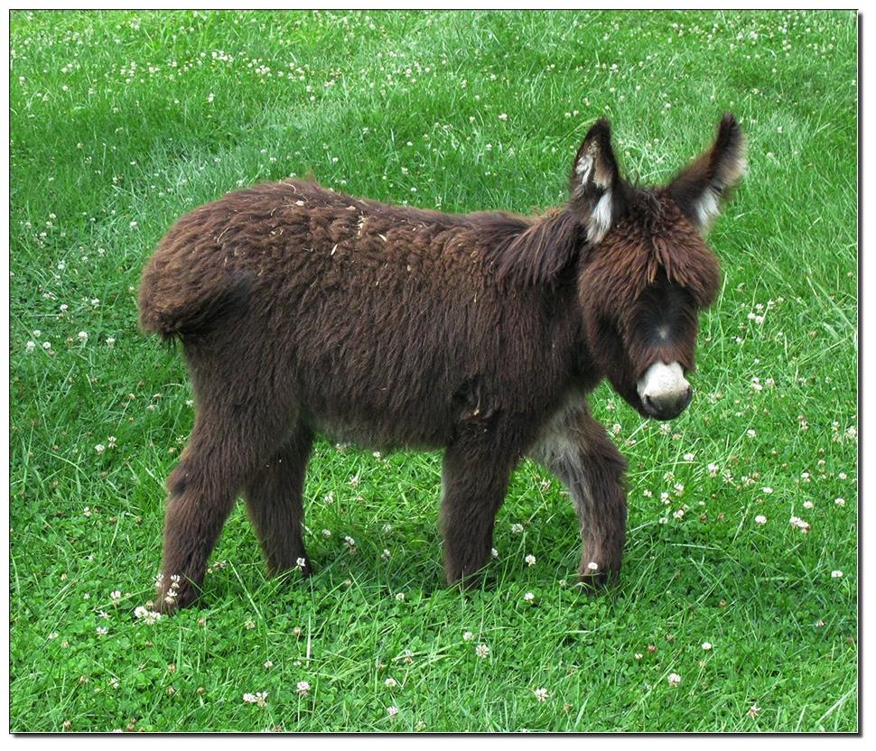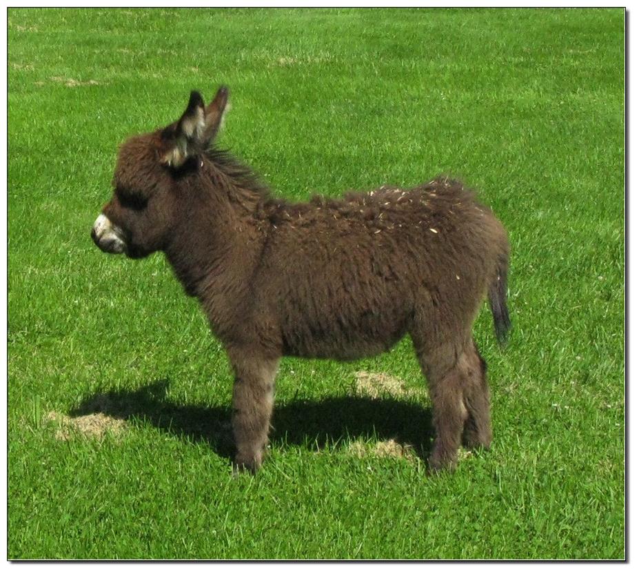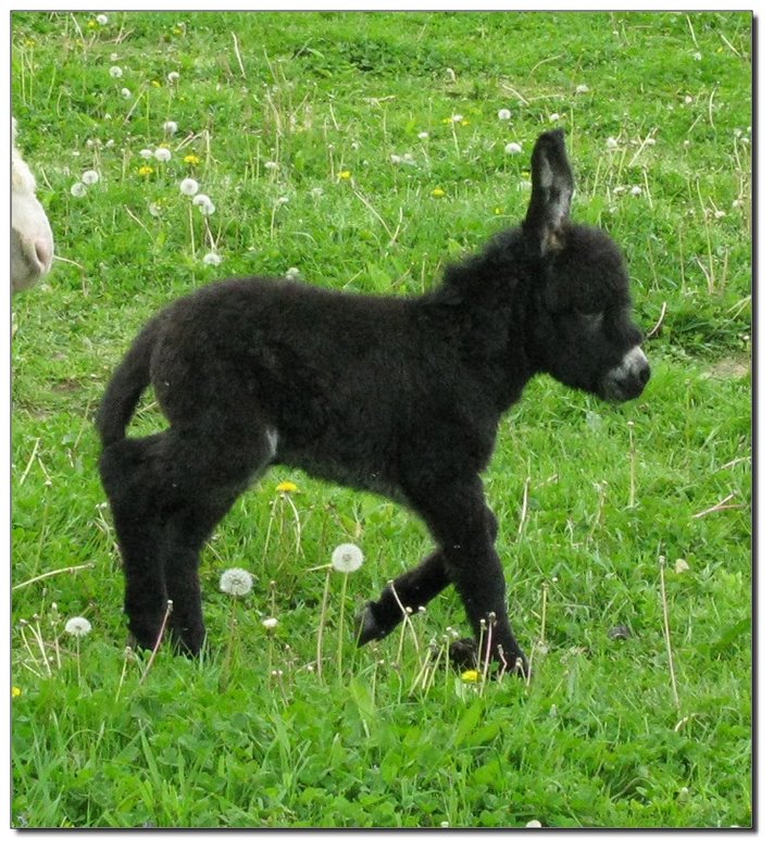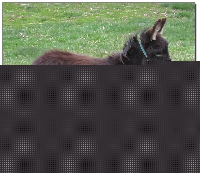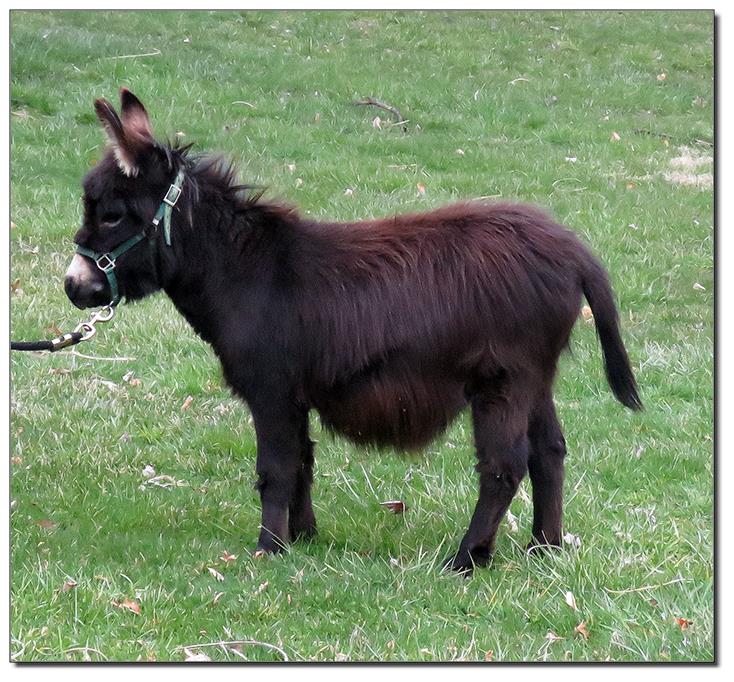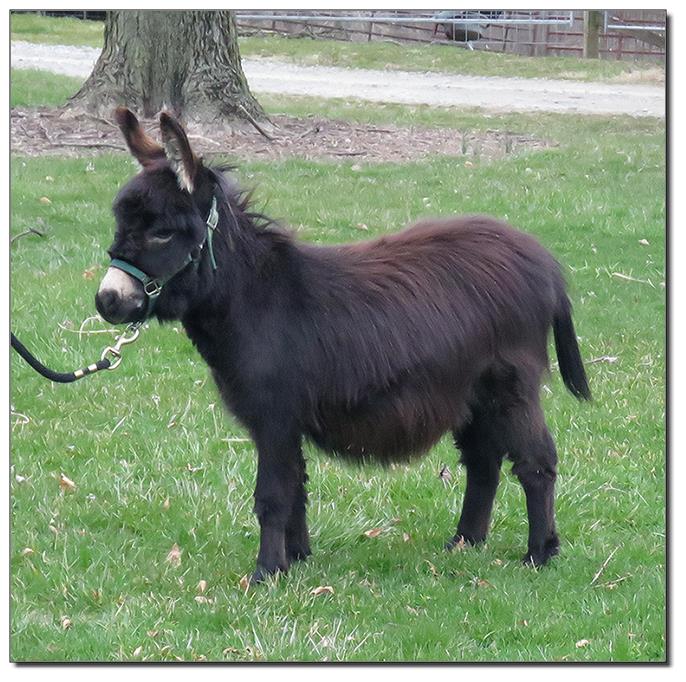 Valeris is a compact and well built jennet. Her dam is Venus Pon Farr, a Fireman daughter out of a Valintino 50 daughter. Pon Farr, a foundation jennet of excellence, has had foals that were red, brown, black, black and white spotted, and some were wooly. The sire, Tip Top, is a wonderful compact wooly jack combining the Little Red Hairy and the Harry Houdini blood lines. The Elms Valeris, at almost one year, measures 28 1/4”, and is black. She has a spunky personality, very willing to halter and lead, good for the farrier. She shows a longer than average foal coat in these pictures, but I expect her to shed out normally this year. She is not a wooly donkey. We think she would be a good show jennet, with that outgoing attitude, the upright head carriage, and what will probably be a naturally shiny black coat.