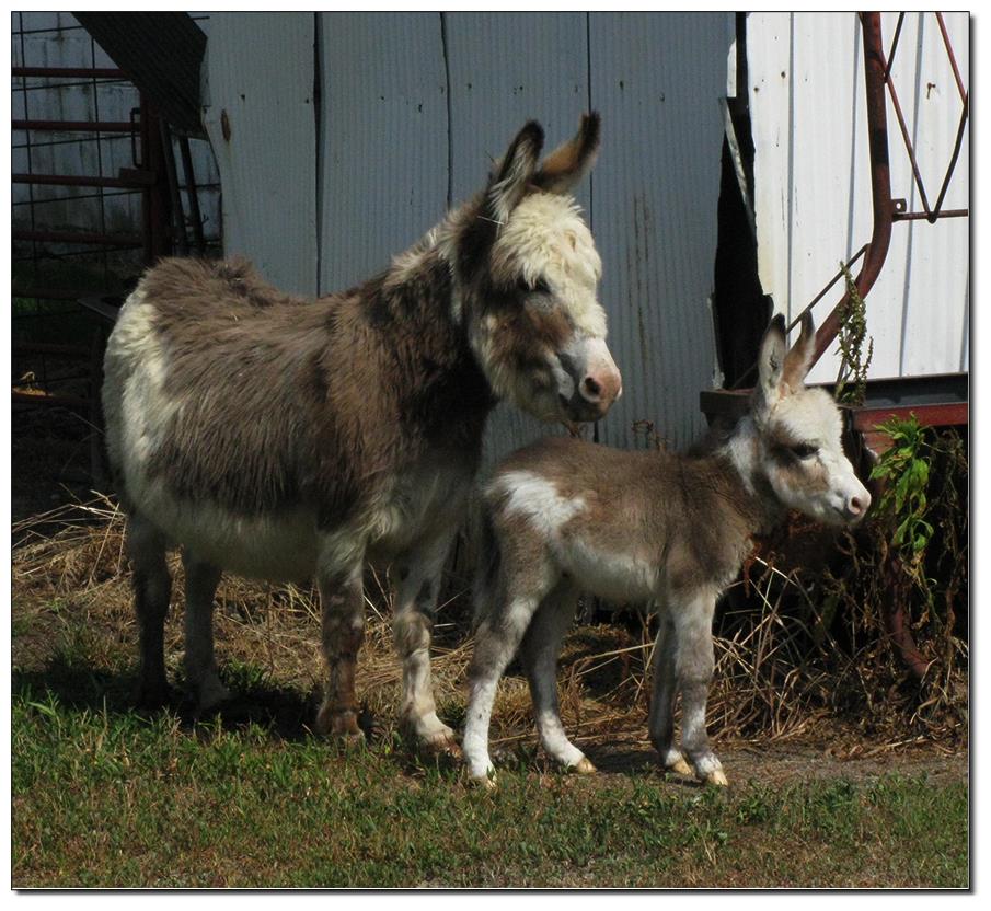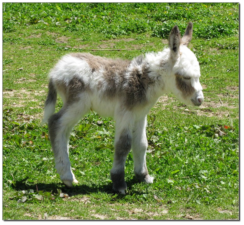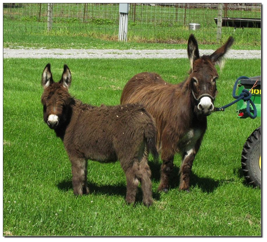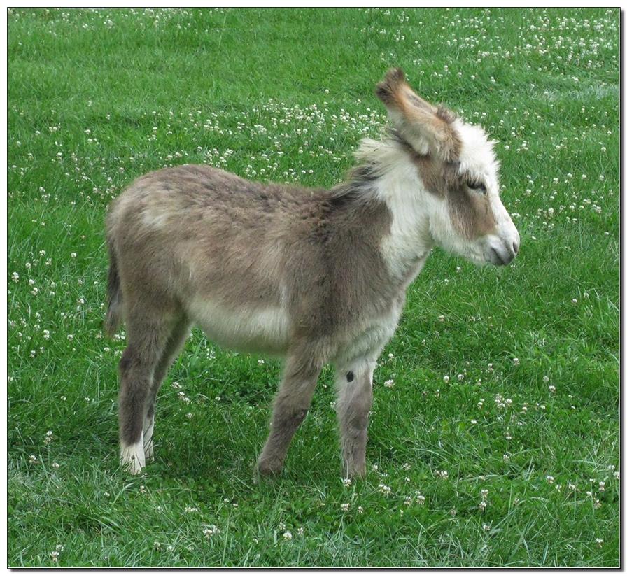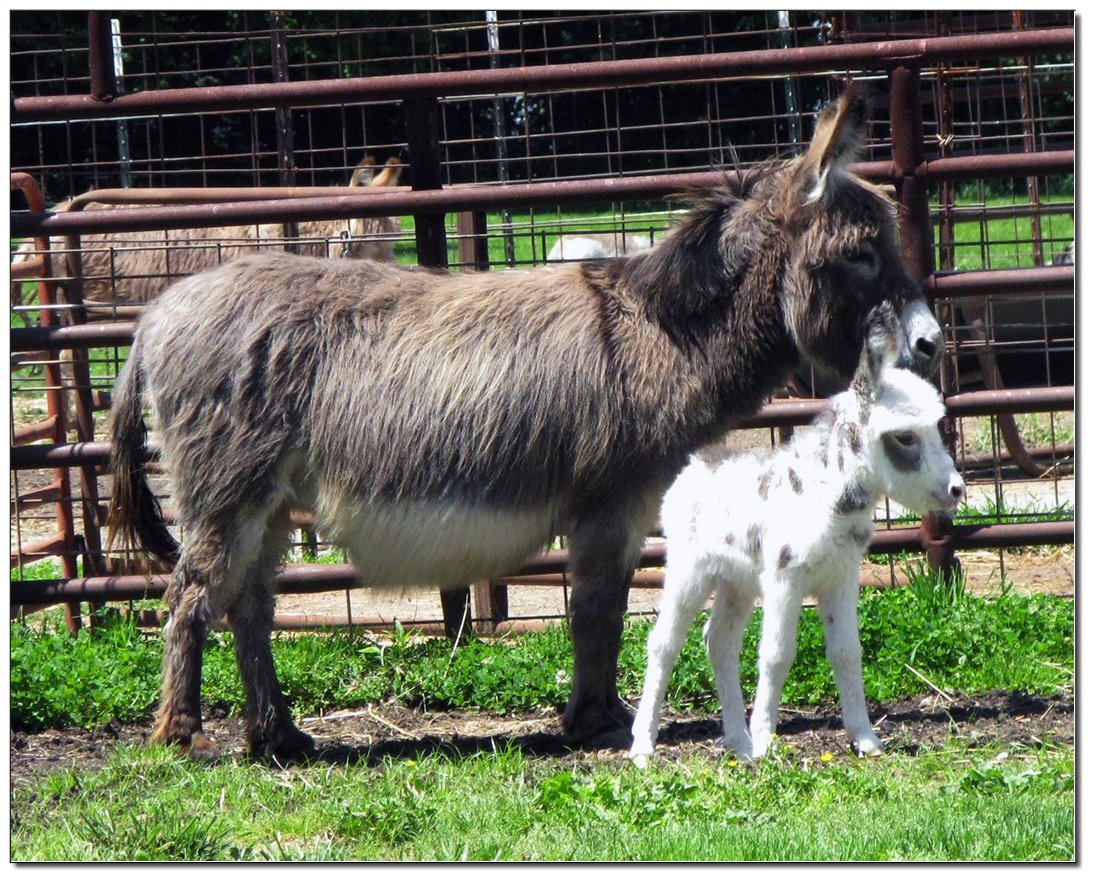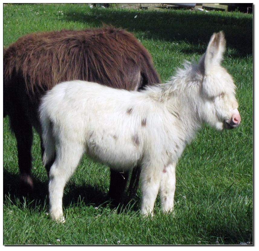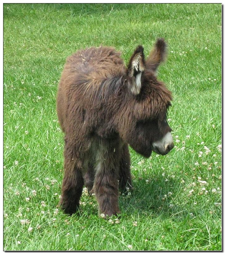 Valeris is a compact and well built jennet. Her dam is Venus Pon Farr, a Fireman daughter out of a Valintino 50 daughter. Pon Farr, a foundation jennet of excellence, has had foals that were red, brown, black, black and white spotted, and some were wooly. The sire, Tip Top, is a wonderful compact wooly jack combining the Little Red Hairy and the Harry Houdini blood lines. The Elms Valeris, at almost one year, measures 28 1/4”, and is black. She has a spunky personality, very willing to halter and lead, good for the farrier. She shows a longer than average foal coat in these pictures, but I expect her to shed out normally this year. She is not a wooly donkey. We think she would be a good show jennet, with that outgoing attitude, the upright head carriage, and what will probably be a naturally shiny black coat.